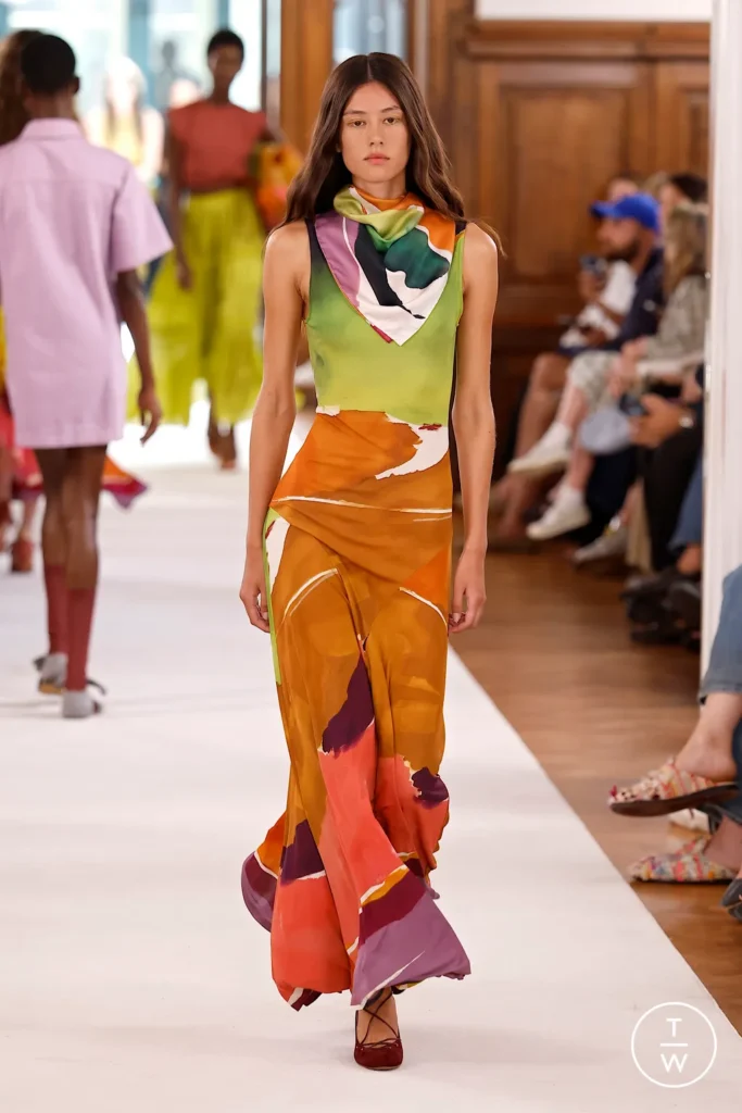 Color moved beyond the familiar pastels of spring. Yes, there were peaches and lavenders, but the standout tones were sunset-inspired: mustard, rust, and indigo blues — a direct nod to Frankenthaler’s painting Moontide.Snippets of a 1993 Frankenthaler interview played as a backdrop, where she mused, “‘Beautiful,’ which is always a tricky word, but now it’s become an incendiary word.”