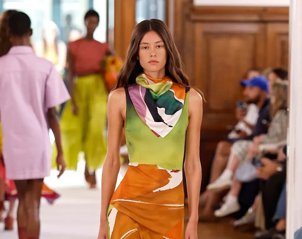 Color moved beyond the familiar pastels of spring. Yes, there were peaches and lavenders, but the standout tones were sunset-inspired: mustard, rust, and indigo blues — a direct nod to Frankenthaler’s painting Moontide.Snippets of a 1993 Frankenthaler interview played as a backdrop, where she mused, “‘Beautiful,’ which is always a tricky word, but now it’s become an incendiary word.”