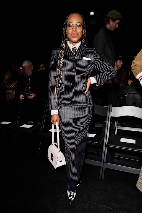 Kerry Washington was suited up in a head to toe navy pinstriped blazer and maxi skirt Thom Browne look.