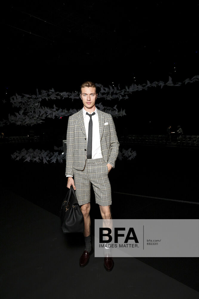 Model Lucky Blue Smith in a plaid short suit number with a black tie and accompanying black handbag, and burgundy loafers.
